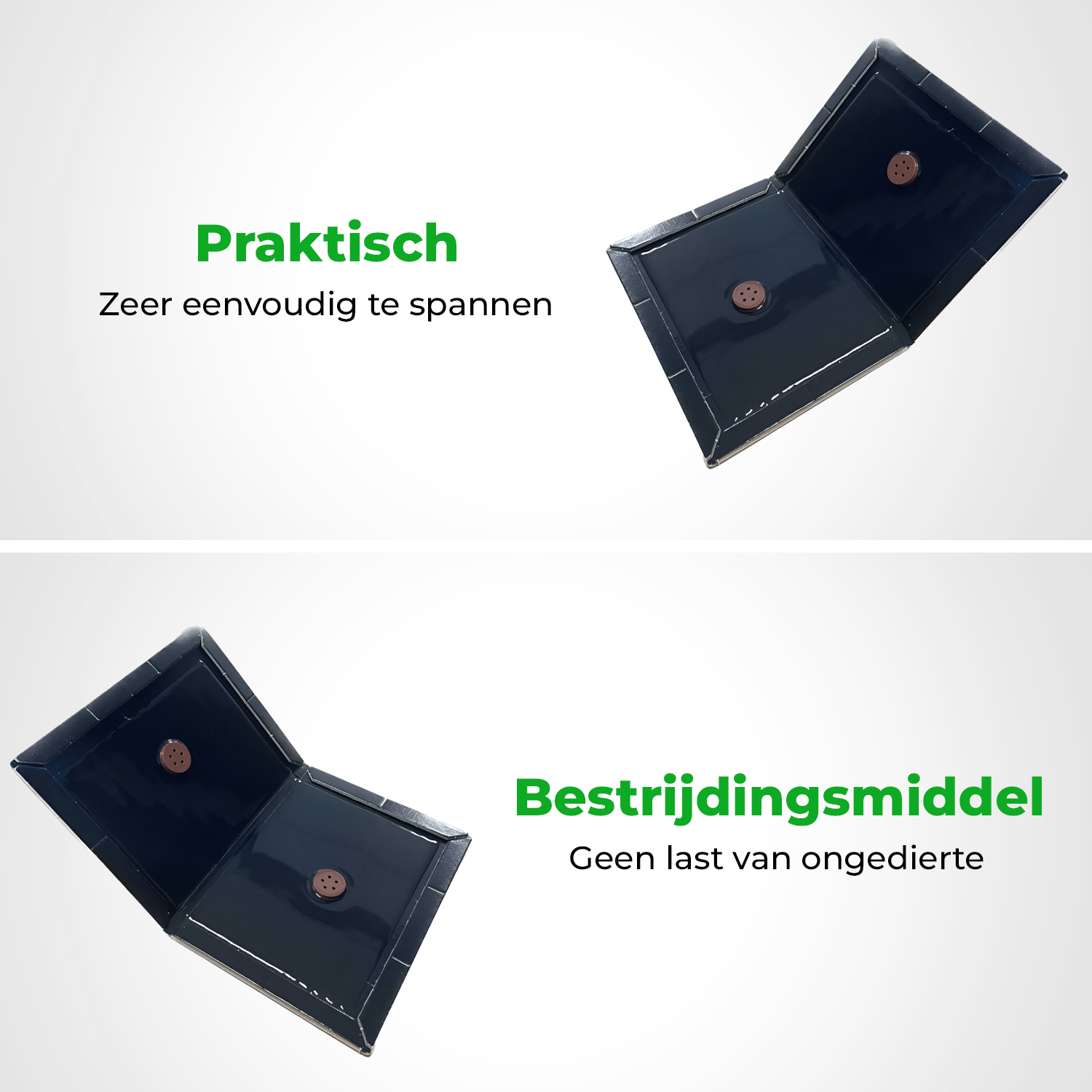 Deze lijmvallen zijn van het formaat A5 met een stevige kartonnen ondergrond. In het midden van de lijmval zijn er twee schijfjes waar lokmiddel op geplaatst kan worden.