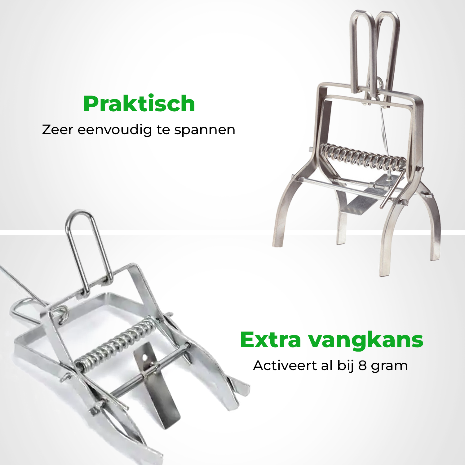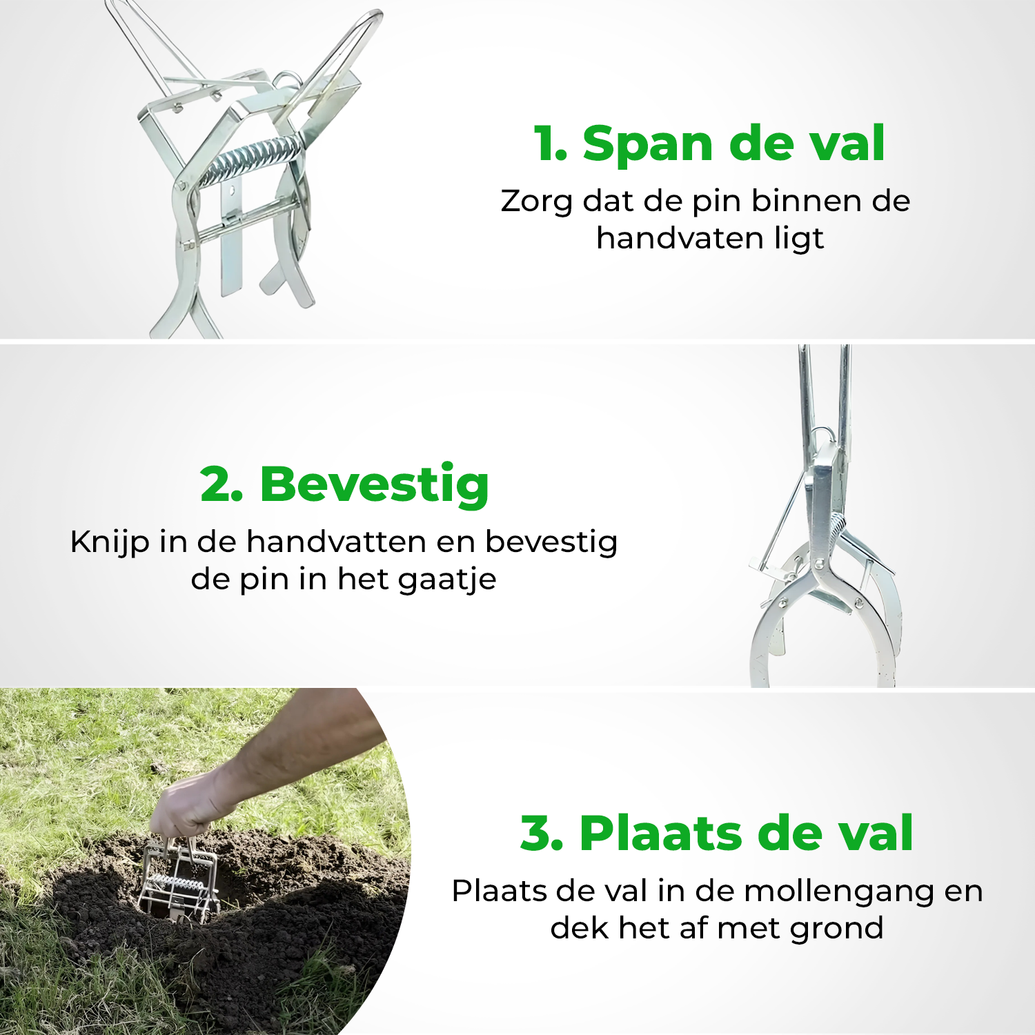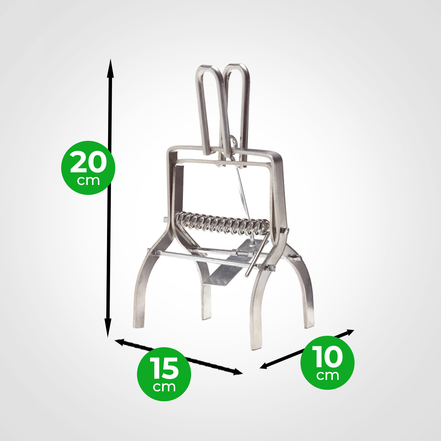 Deze mollenklem maakt het mogelijk om mollen te vangen zonder het gebruik van chemicaliën. De klem is eenvoudig te spannen door het gat in het valklepje. De mollenklem is gemaakt van gegalvaniseerd staal en is eenvoudig gereed te maken door de handvaten op de mollenklem.