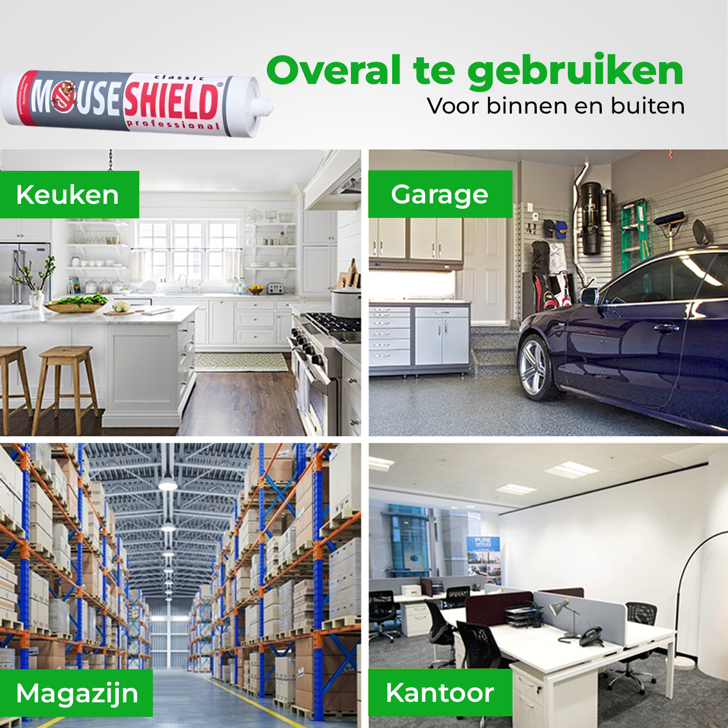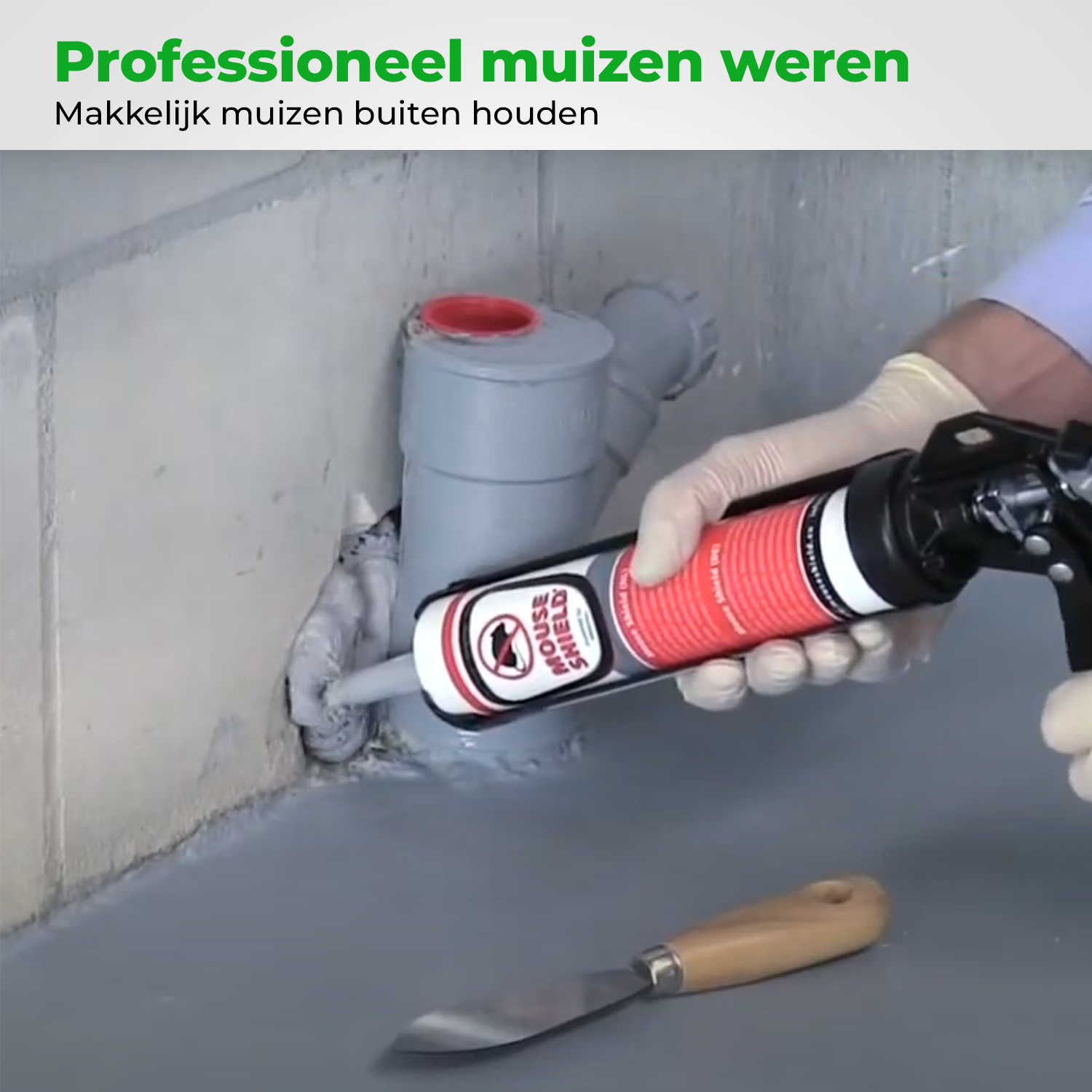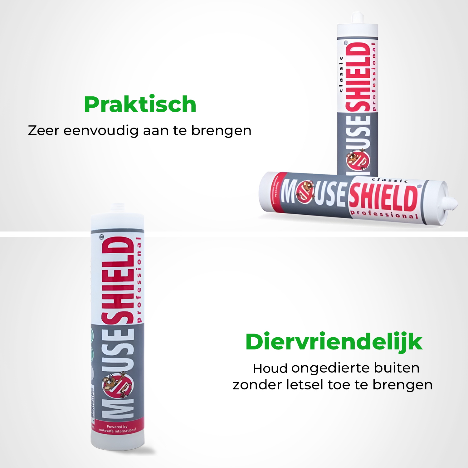 Met deze Mouseshield weringskit is het eenvoudig om ongedierte buiten de deur te houden. De pasta bestaat uit plantaardige oliën, vulstoffen en polystyreen parels wat een ondoordringbare barrière oplevert voor ratten en muizen. De grijs gekleurde kit wordt geleverd in een koker van 300ML. De kit verspert alle toegangswegen maar doodt het ongedierte niet.