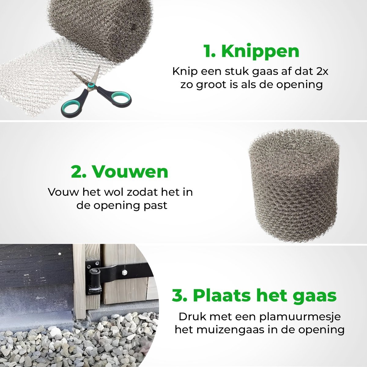 Het Muizengaas gebruik je om onder andere kieren en naden te dichten in muren. Ook in de boeiboorden aan het dak is het een effectief afweermiddel. Door de samenstelling van het Muizengaas blijft ventilatie mogelijk. Het Muizengaas is gemaakt van RVS 316, waardoor het beschikt over een lange levensduur.