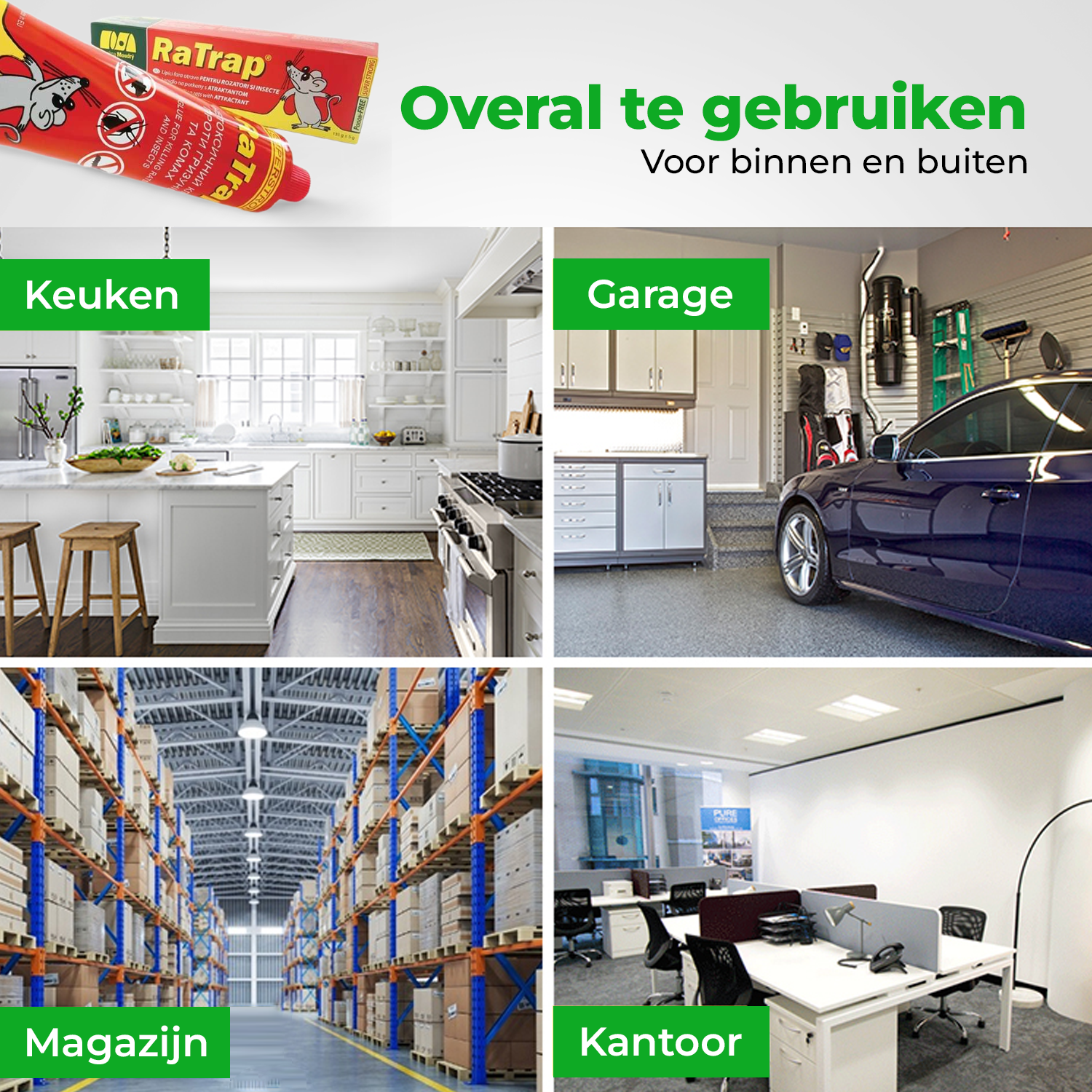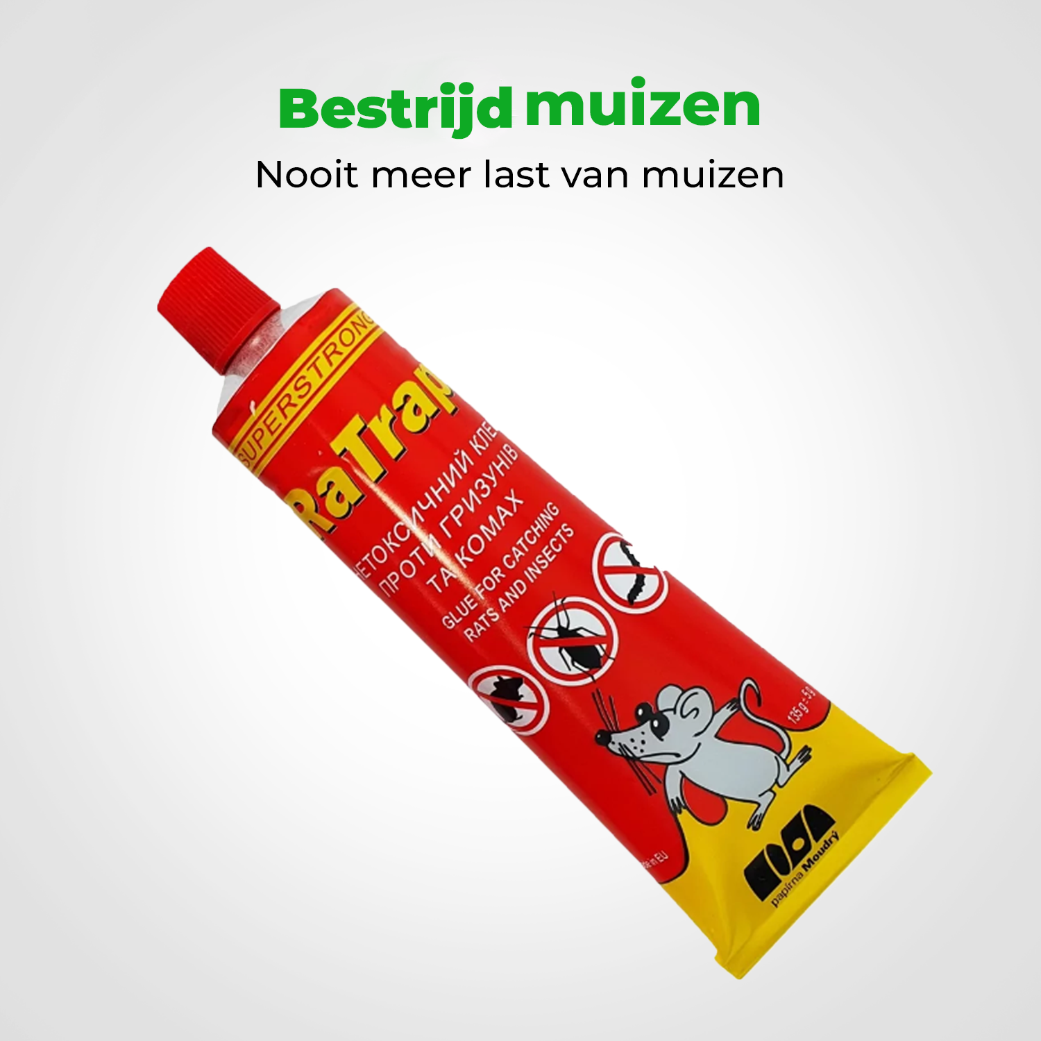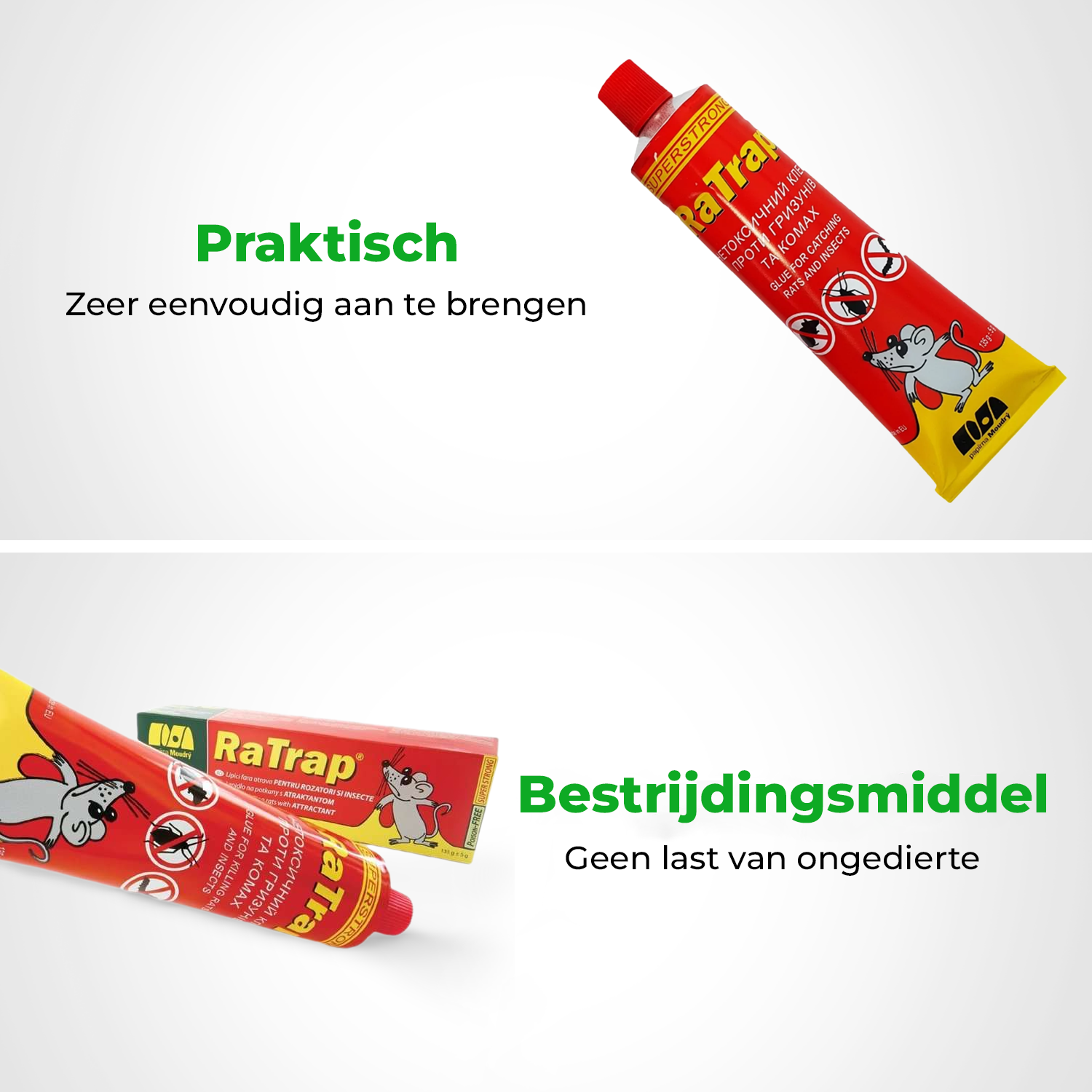 Met RaTrap is het makkelijk om zelf een muizenval te maken. Smeer de lijm op bijvoorbeeld een stuk karton of een stuk hout en plaats deze waar de overlast van muizen of ratten zich bevindt. De tubes bevatten 135 gram.