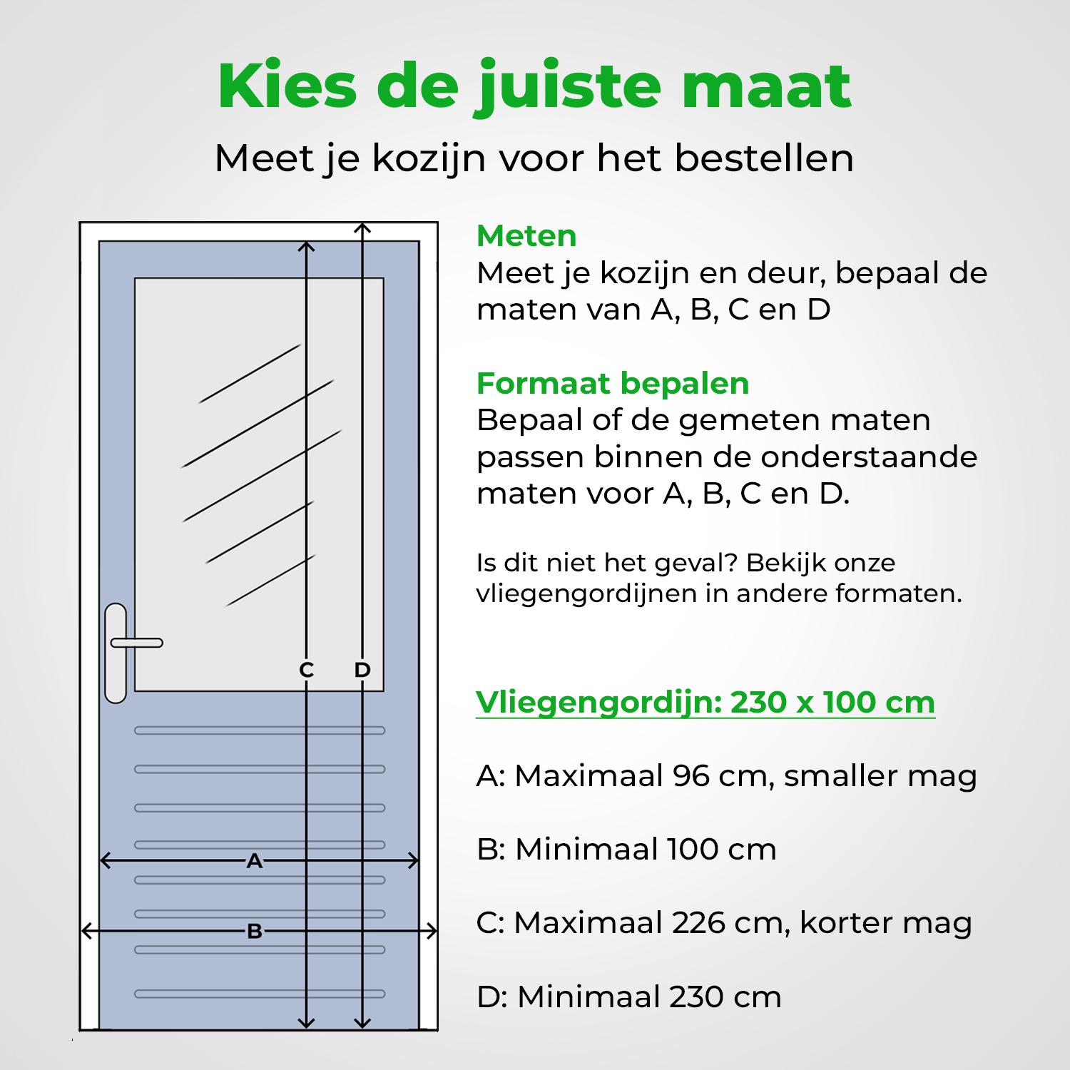 Let op! Meet voor het bestellen eerst je kozijn. Zie de productfoto's voor de meetinstructies. Er zijn meerdere maten beschikbaar van ons vliegengordijn.