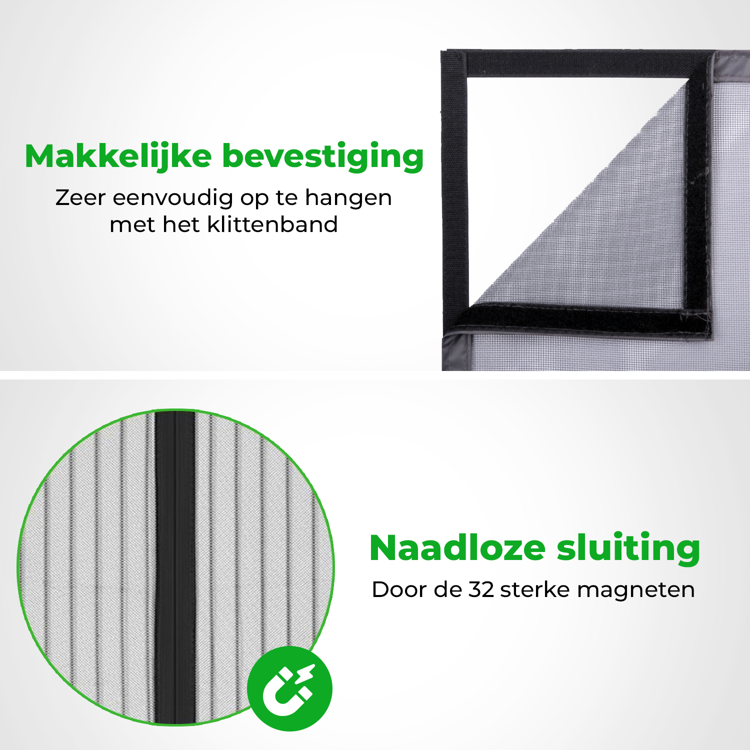 Het vliegengordijn van VerminBuster is uitgerust met 32 magneten. Dit in tegenstelling tot veel concurrenten waarbij het vliegengordijn over veel minder magneten beschikt. Het vliegengordijn van VerminBuster sluit door de vele magneten naadloos. Hierdoor is het voor insecten onmogelijk naar binnen te gaan.