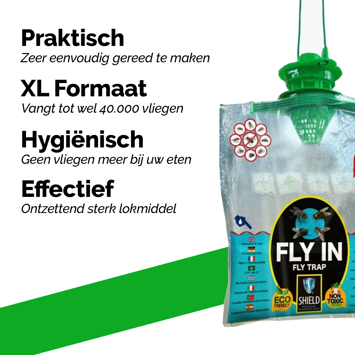 De vliegenval XXL is een extra grote uitvoering van de gifvrije vliegenval. De vliegenvangzak is ecologisch-verantwoord. Er kunnen tot wel 40.000vliegen gevangen met deze vliegenzak. De vliegenval is te gebruiken voor in je tuin of op de plaats waar je vuilnis staat. De vliegenval is simpel te gebruiken, volg de aanwijzingen op het product. Er hoeft enkel water aan de val toegevoegd te worden. De al toegevoegde lokstof wordt dan automatisch geactiveerd. Nadat de zak geheel vol is kan deze in de normale particuliere afvalstroom.