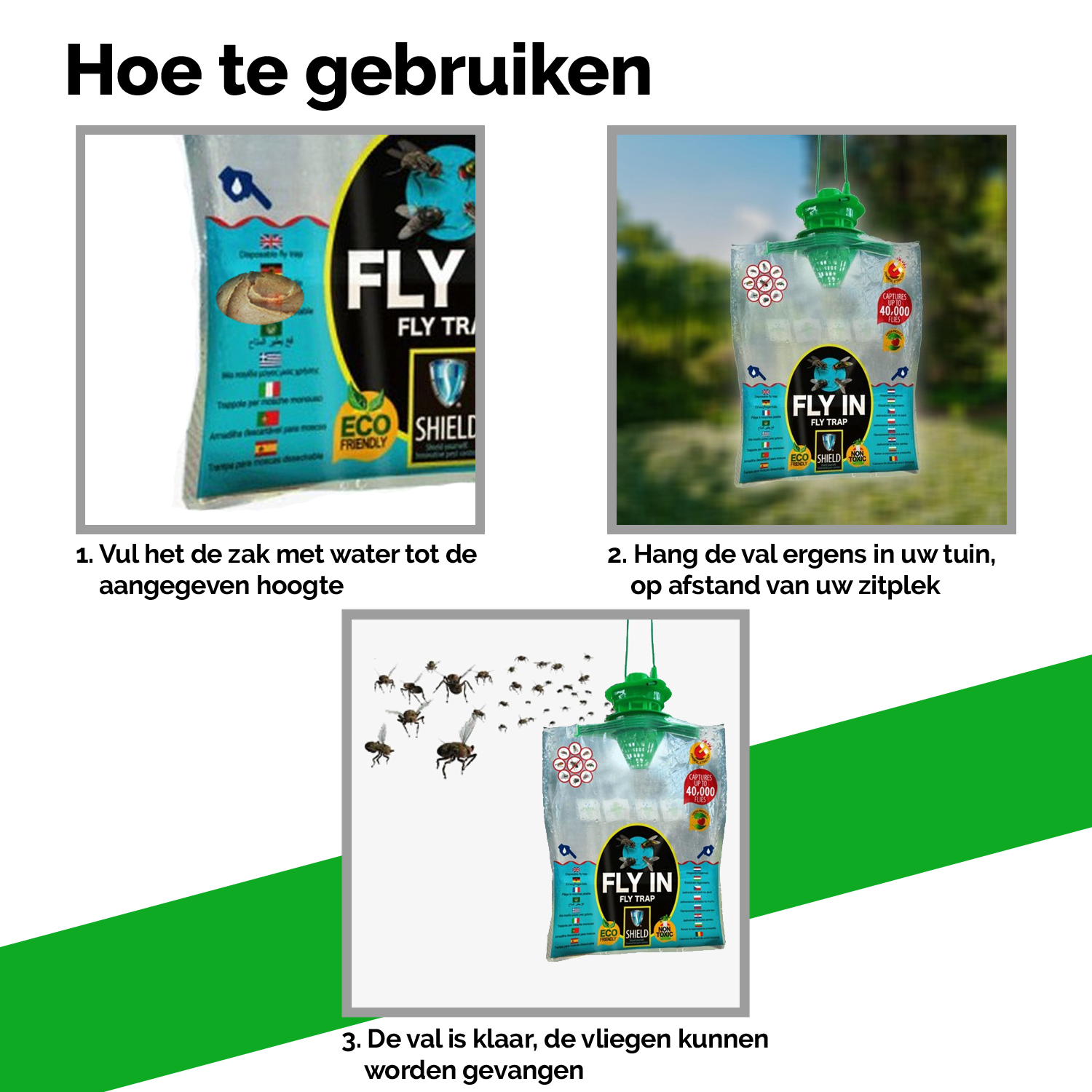LET OP: Vergeet niet om de dop van de zak open te draaien, zodat de vliegen ook naar binnen kunnen.